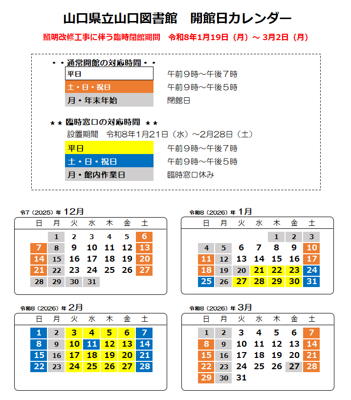 - 1月19日から3月2日まで臨時閉館いたします。期間中、臨時窓口を開設します。詳しくは、重要なお知らせ「照明改修工事に伴う臨時閉館中のサービスについて」をご参照ください。